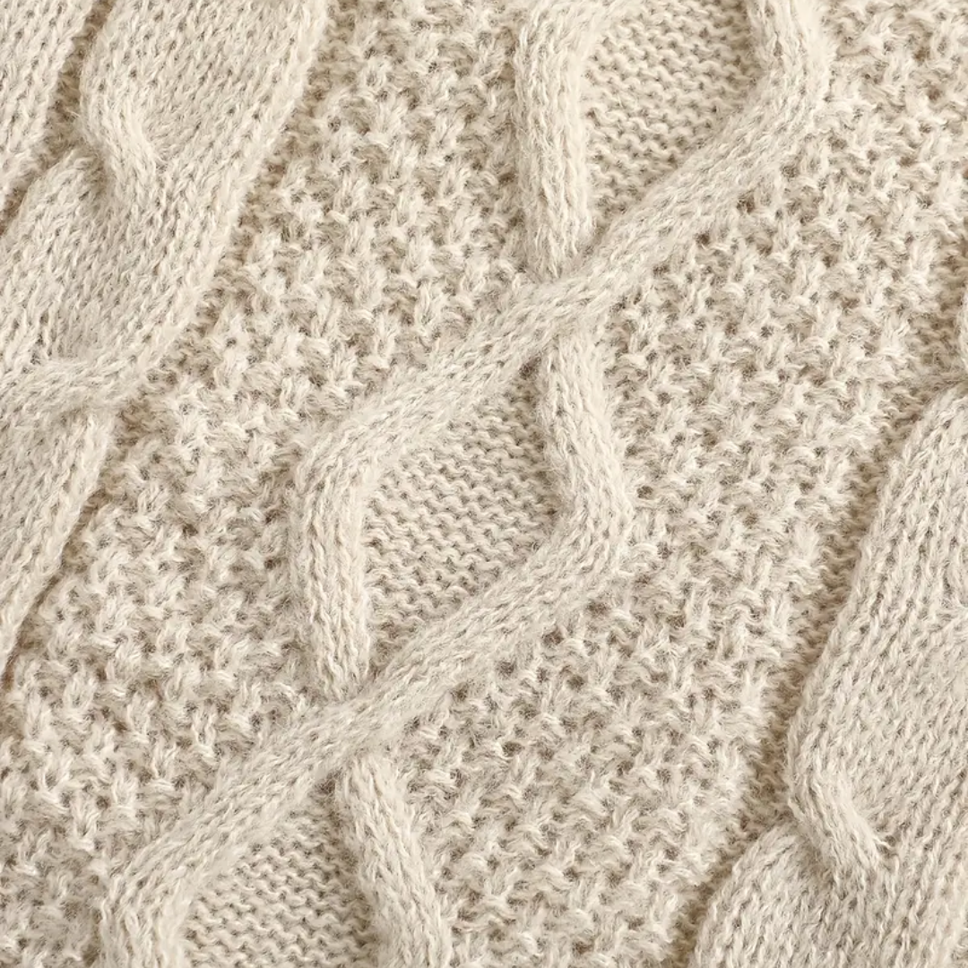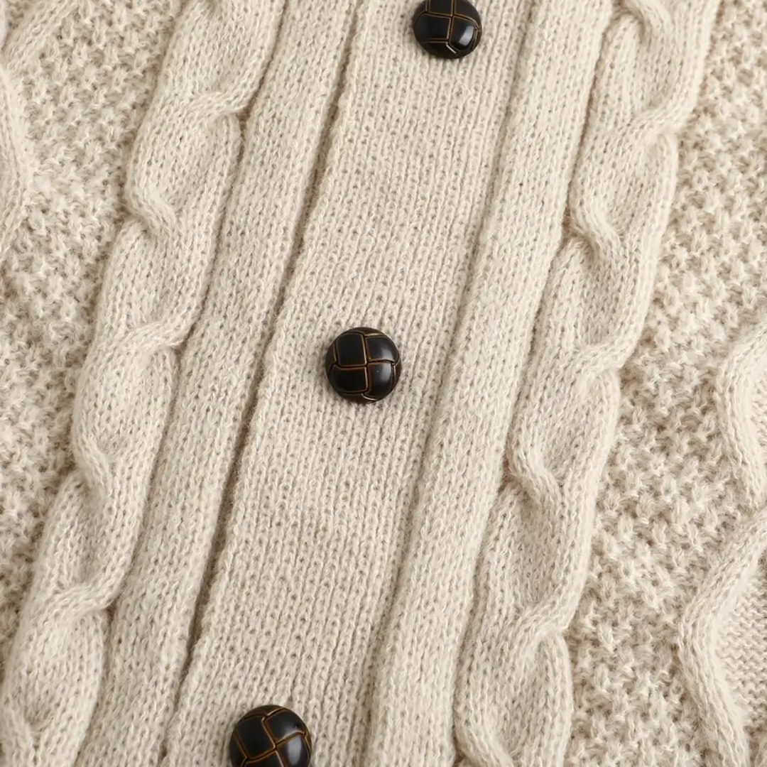 2. Tijdloos Ontwerp: Klassieke knoopsluiting en verfijnde kabelpatronen.